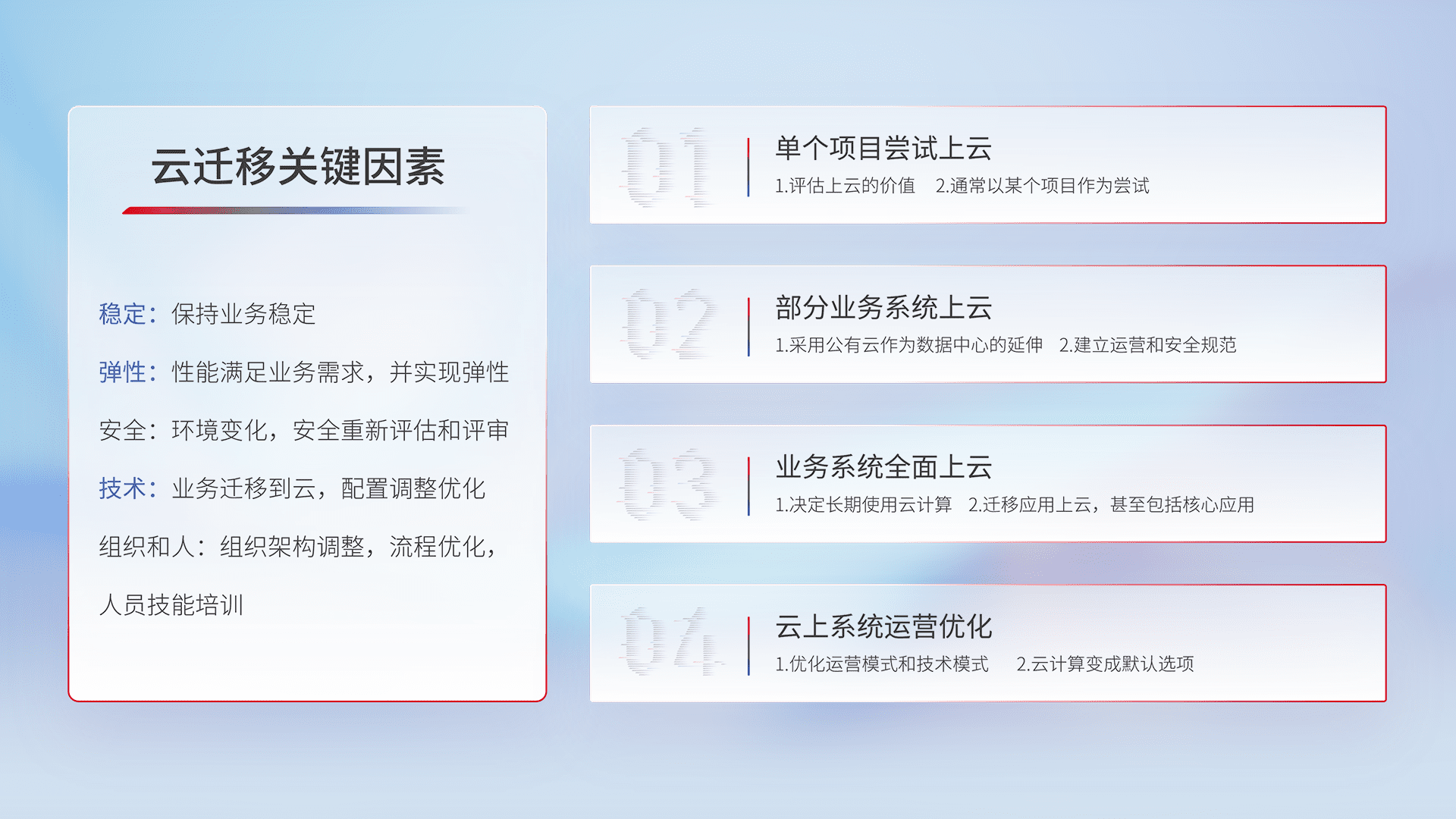 结合实际业务,,,,从规划设计、、、云平台选型、、云原生改造、、数据迁移、、集成交付,,,迁移全过程为客户识别最佳上云路径,,,,做好风险识别管理,,设计网络架构、、、、身份权限、、、安全审计合规、、、、操作审计、、日志审计、、监控告警策略、、多站点容灾设计等,,,,对云上基础设施进行整体规划,,,提升IT治理水平,,,以满足弹性、、高可用、、、、高性能的需求。。